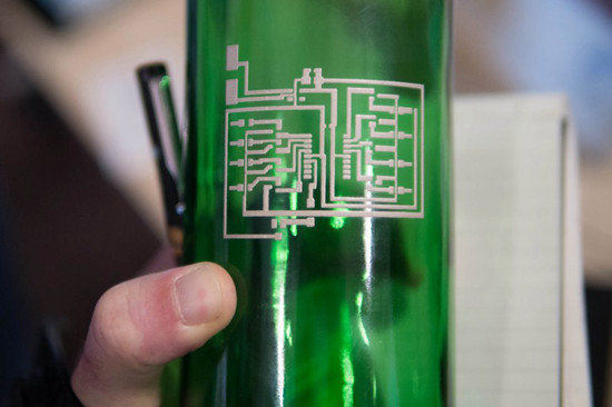 上圖中的產(chǎn)品來自于一家名字聽起來略微有點沒想象力的公司:Printed Electrics(打印電子元件)。這家公司的客戶涵蓋航天到汽車領域,圖中產(chǎn)品正是根據(jù)一位客戶的要求(想要擁有一種在任意3D表面皆能打印電子元件的方式)所開發(fā)的。而現(xiàn)在,這家公司又在試圖為這種技術尋找其他的應用方向。在展會上,這家公司為筆者展示了自己的技術:他們直接在一支酒瓶上打印出了電路、微控制器、溫度傳感器和LED。