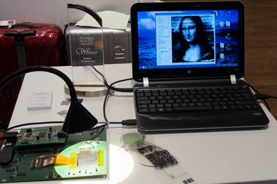 說到具備閱讀能力的顯示屏,上圖中所展示的技術也具備這種能力。雖然它對比柔性圖像傳感器可能顯得不那么高科技,但也算非常有趣。這項技術名為Touchcode,來自于一家名為T+Ink的公司,他們的目標是使用自己的技術在某些應用領域取代相對昂貴的RFID技術。使用RFID技術時,你需要把電子元件嵌入到公交卡或者鑰匙鏈等物品當中。而T+Ink的技術只需要導電墨水即可,很顯然,他們的技術能夠以一種更為廉價、輕薄和柔性的方式將信息傳輸?shù)介喿x器當中。