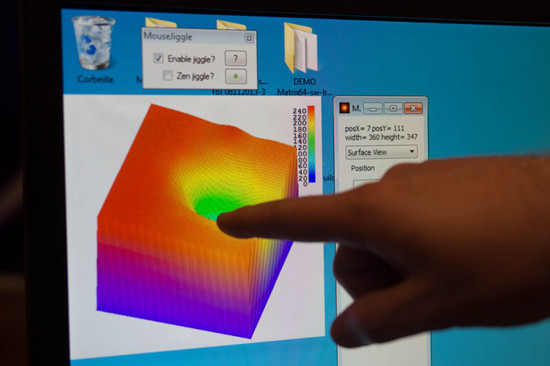 ISORG將自己的傳感器陣列直接放置在了一部非觸控LCD顯示器的屏幕面板之后。在上圖中,操控者的手指并未接觸到屏幕,只是在其上方進行移動,而軟件依然可以對手指的運動進行跟蹤。這種程度的敏感度讓人印象深刻。